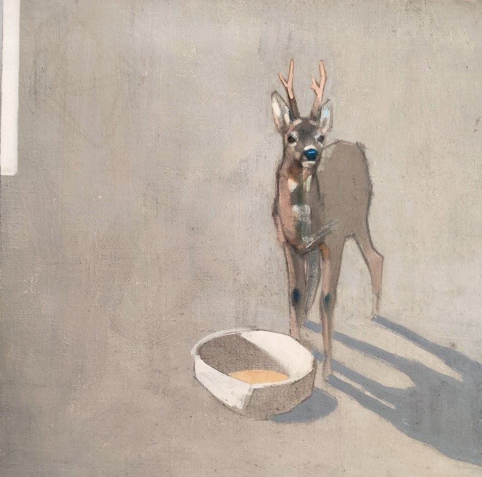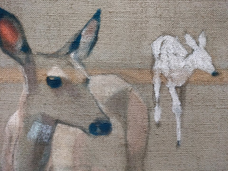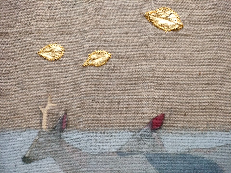 Some deer and others were painted with egg tempera and clay. Stitches, gilded leaves and phosphorescent pigments were added.
